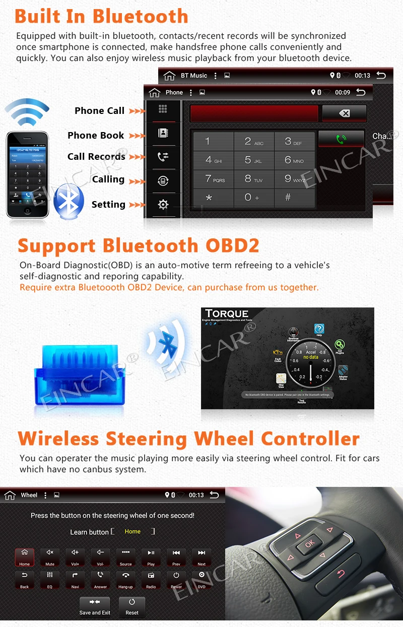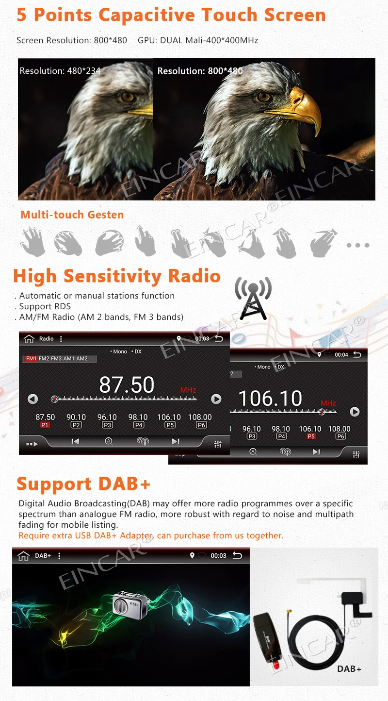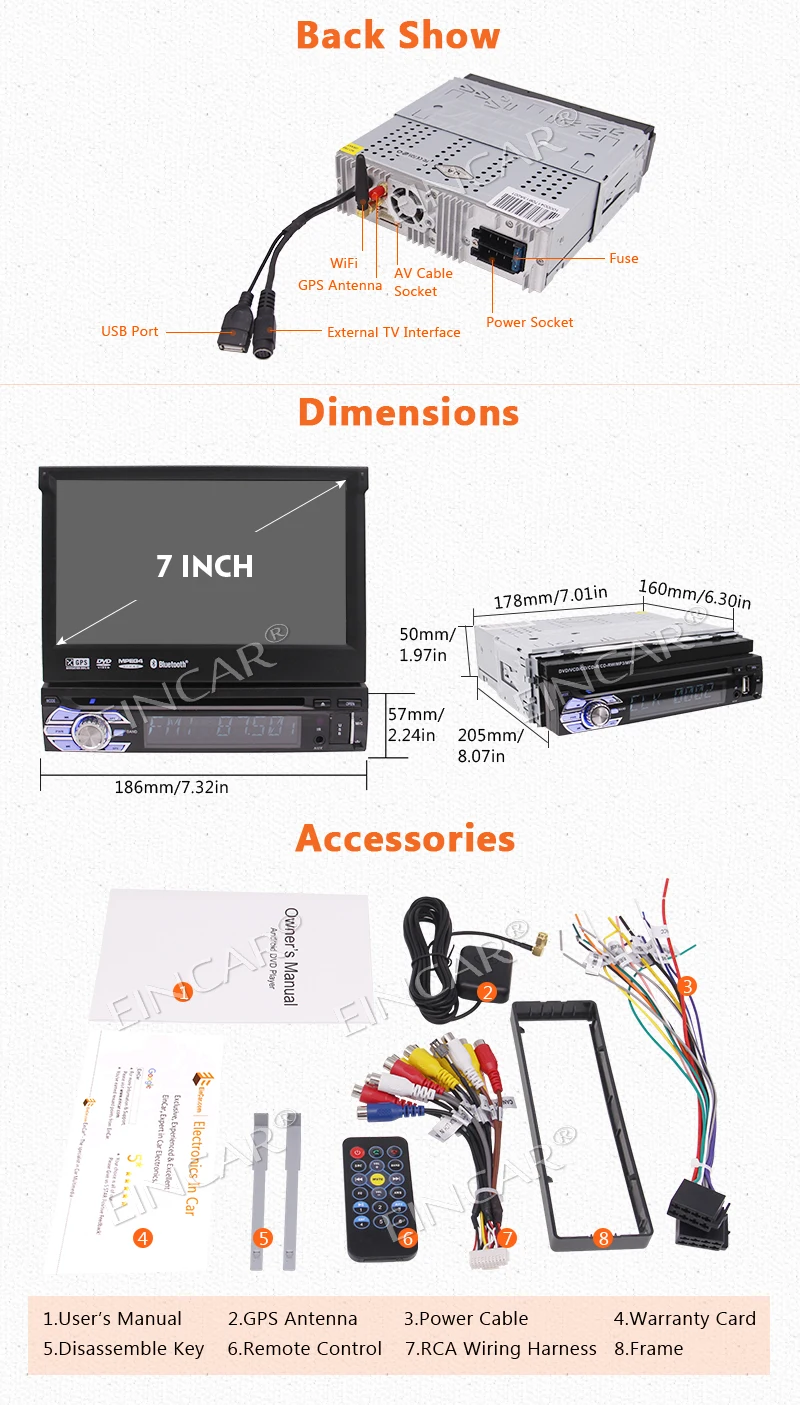 Specifications: Latest Android 6.0 Operating System CPU Processor: 1.6GHz Quad-Core RAM 2GB+ ROM 16GB Support HD 1080p Videos Detachable Panel for anti-theft Car Opening Logos is Optional. Customers can choose pictures as opening logos from SD card in factory setting Live Wallpapers Selectable 7 Inch High Definition Capacitive Screen Steering Wheel Control Function Headrest Display synchronization Support Rearview Camera, Front Camera input Hands-free Bluetooth calling and audio streaming 7 Colors LEDs button indicator - Built-in WiFi function: If there is wifi signal, you can connect to it directly. Or you can use your mobile phone as a portable Wi-Fi hotspot, and share its data connection with this stereo's Wi-Fi. - Support 3G/4G Modem to surf the internet: With connection of a 3G/4G wireless USB modem, can enjoy the use of the internet on this player. 3G/4G Dongle not included. - Support thousands of softwares downloading from Android market, such as MSN, Skype, Gmail, 2/3D Games etc. - AM FM Radio: Built-In Radio Tuner (30 Preset Stations) Built-In RDS Auto-Memory Function Radio Regions: Europe, Russia, American, Japan, Australia, China - Input & Output: 1 x Camera Input: Can connect rear camera, with it, you can watch reverse image for safe reverse 1 x AUX Video Input: Can connect front camera 2 x Video Output: Can connect headrest monitor, after connect it, rear passengers can watch the unit's DVD movie 2 x USB Port: Can support USB flash drive with maximum 32G compatibility, One for 3G/4G Dongle. Optional Items(not include, need extra pay): Front camera Rear view camera Wireless rear view camera Car DVR video camera 3G/4G Dongle OBD2 Scanner OBD+ Adapter