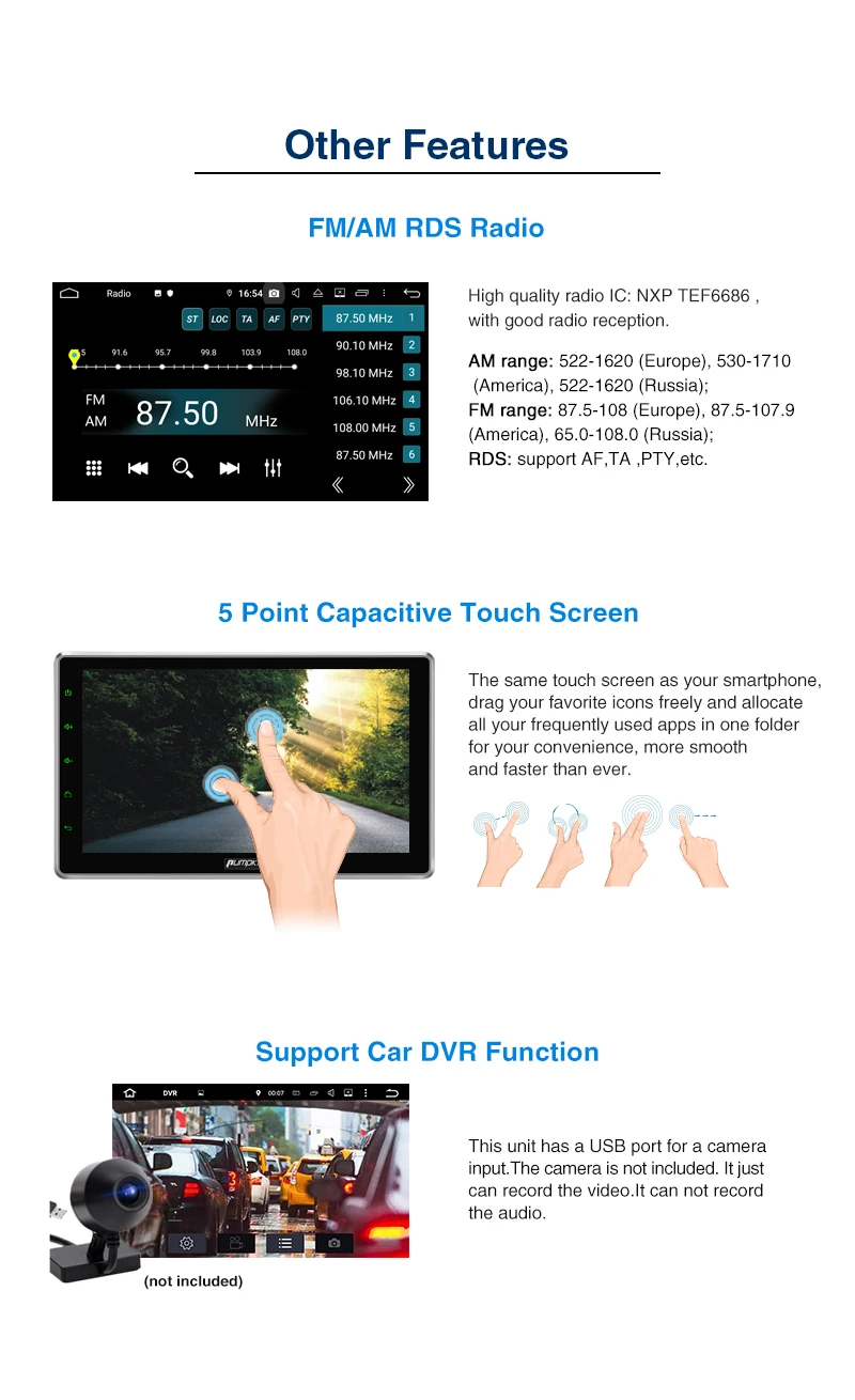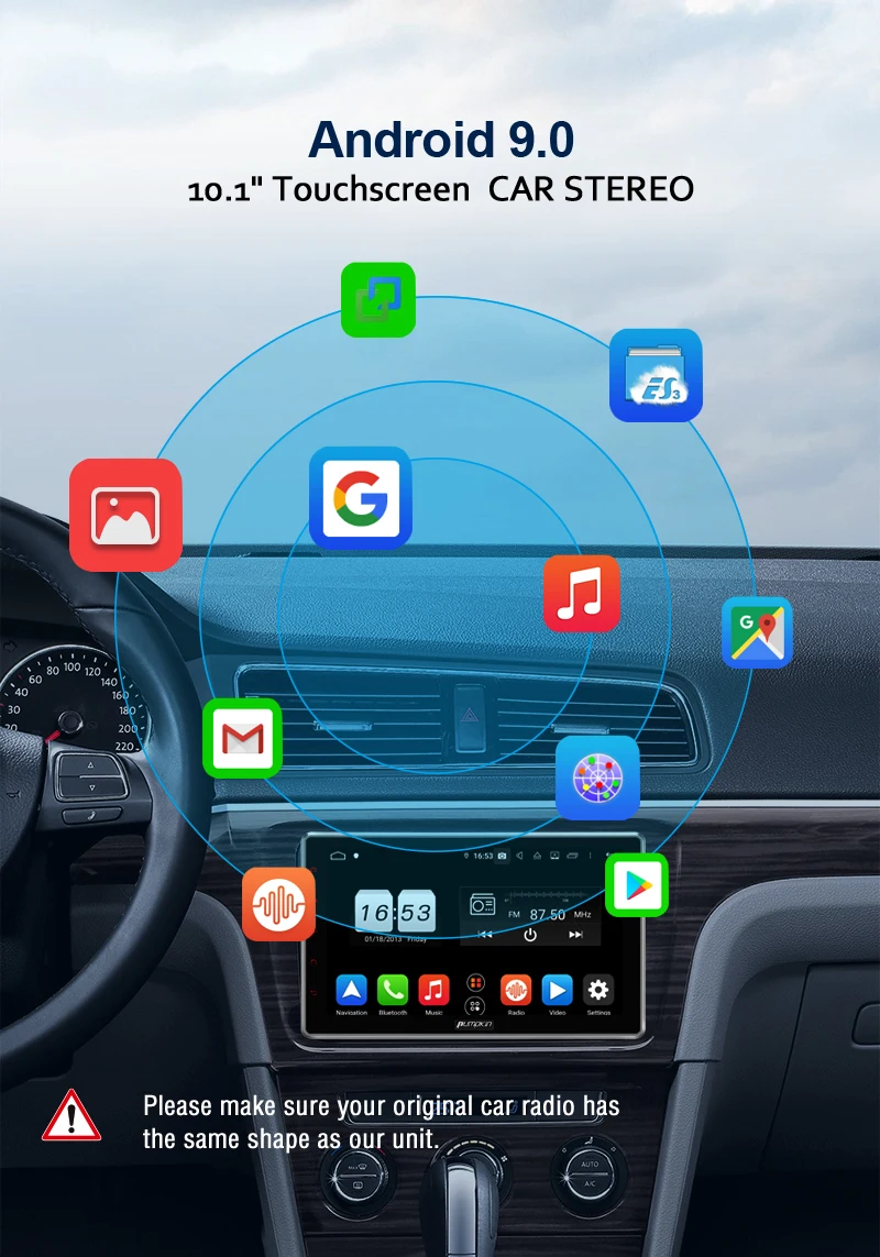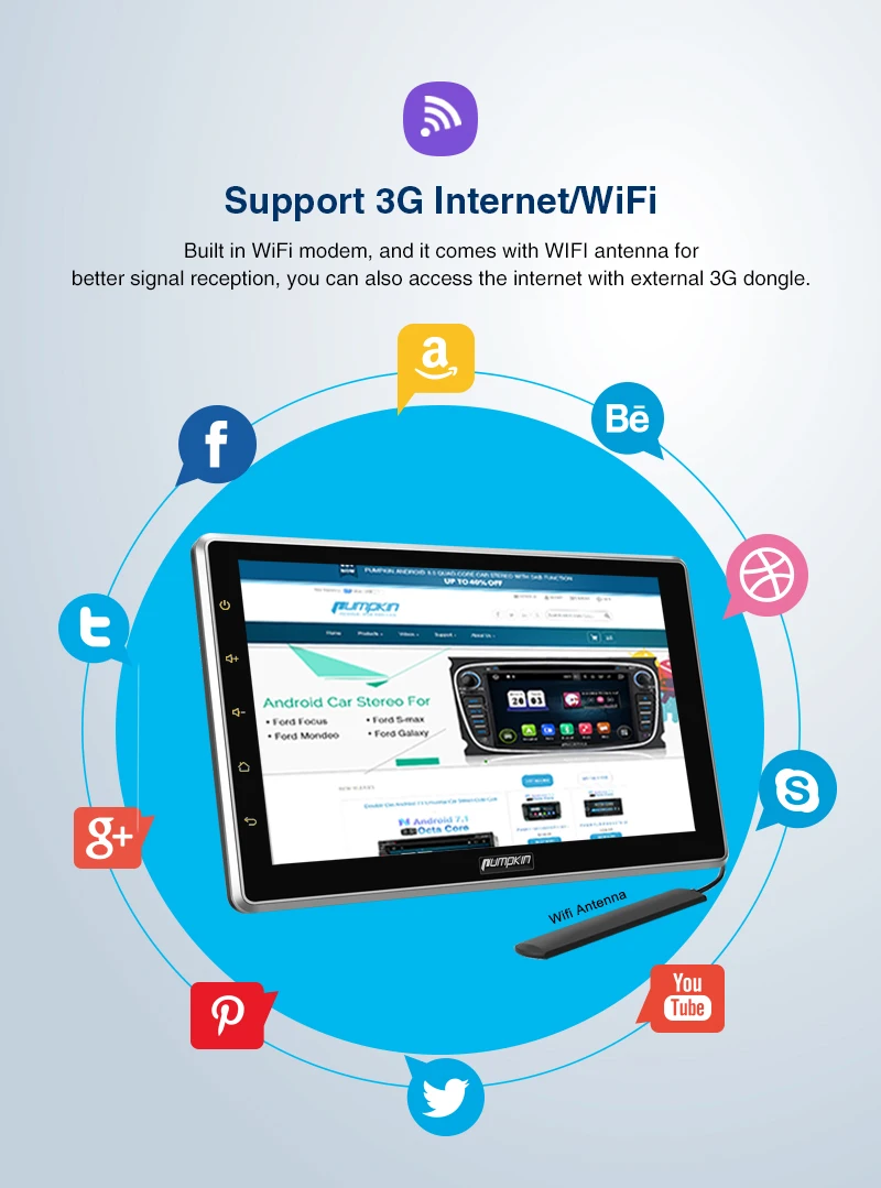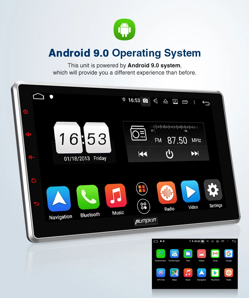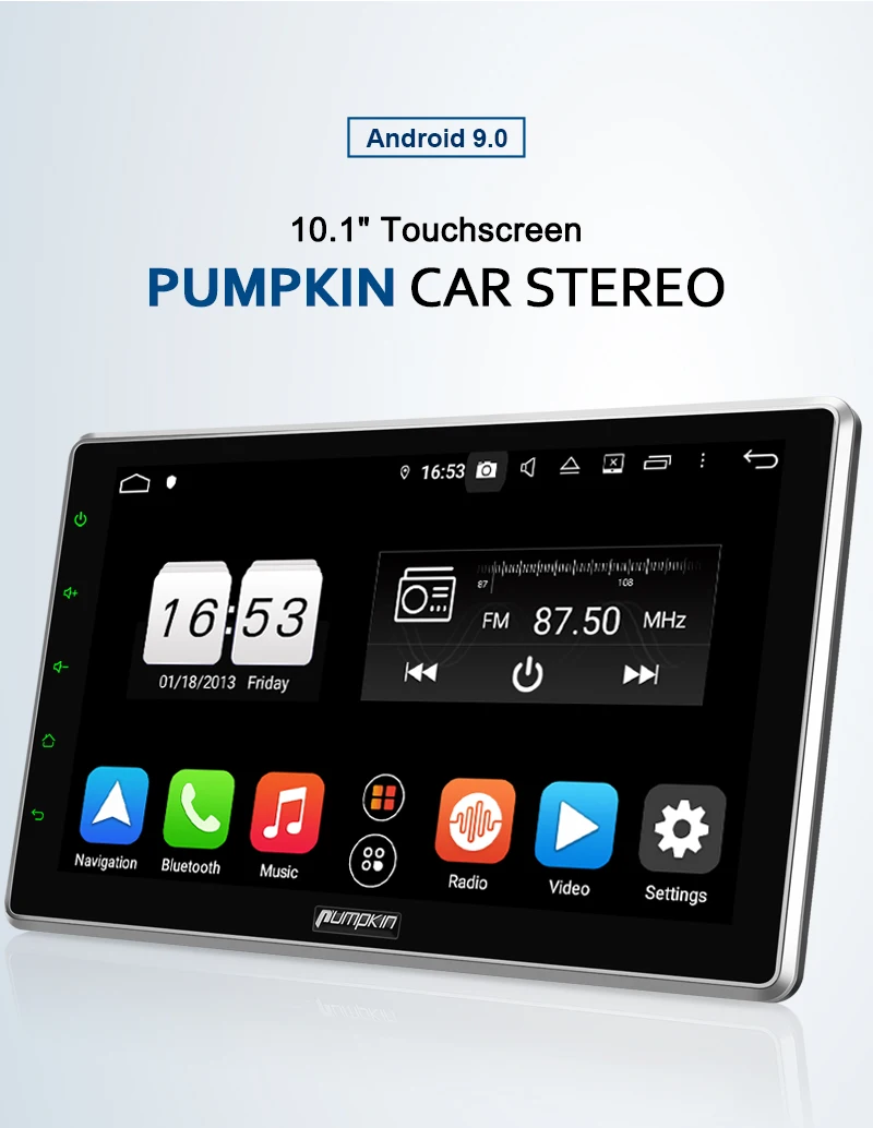 Pumpkin 2 Din 10.1''Android 9.0 Universal Car Radio No DVD Player GPS Navigation Octa-core 2G+32G Car Stereo Audio Wifi OBD2 DAB Specifications: General: OS: Android 9.0 CPU:Octa-core CPU Processor RAM: DDR3 2GB Nand Memory: 32GB Radio IC: NXPTEF6686 Bluetooth: BT 4.0 Working Voltage: 10.8~14.8V DC Audio output: 4*50W Max Boot time(2nd time): about 2s Screen: Screen Size: 10.1-Inch Digital Screen Resolution: 1024*600 Capacitive Touch Screen (5 points) Image Brightness /Contrast/ Color Adjustable EQ Built-in TDA7851L amplifier IC,Supports subwoofer audio output, and control it separately. Max audio output: 4 X 50W, Multi-color button light Panel buttons light RGB color are available, you can change it freely to match your car Phone Mirroring Mirror your phone on the 10.1inch screen . ForAndroidphone, youcanmirrorandcontrolontheunitviaUSBcableconnection, AirPlayForiPhone,youcanjustmirrorontheunitviawificonnection, cannotcontrol (support Android 7.0) GPS: Support online and off-line navi app, support 3D Maps and voice guidance,your long journey will no longer be bothered by the nightmare of getting lost. Map Storage Mode: Micro SD Card Voice Guidance: Yes 3D Map: Yes (Support radio/Bluetooth/USB/SDplayback while navigating.) DAB+ Digital Radio (Extra DAB+ box NA7001Brequired) Digital Audio Broadcasting allows you multi-regional music with your local well-known and also new channels. CD sound quality and noise-free in excellent transmission make DAB Radio a special experience in the vehicle. whichmakeDABbroadlyaccessibletomostofEurope. AV Output For this unit, it can output almost everything to your headrests, even you play the video from USB/SD /online youtube video, Many headunits in the market can only output the DVD video to the headrest. Bluetooth4.0 : Built-In Microphone in the control panel for hands free calling function External microphone also included for free clear voice calling Support Bluetooth audio player/Phone Book function, quick search contacts. (Attention: This function can only be realized when the mobile phone supports Bluetooth Audio Output/Contacts Output) Support Bluetooth Connection for iPhone/ Most Android Phones/ Even some None Smart Phone (Attention: The Bluetooth just for audio stream transfer, it doesn’t support file transfer or Internet tethering.) Steering Wheel Control Change the track, volume, etc. conveniently without taking your hands off the steering wheel, which makes your driving much safer. (Attention: Only support resistance based analog signal input steering wheel) Radio Highquality radio IC: NXP TEF6686 ,with good radio reception. AM/FM tuner built in (worldwide) AM frequency range: 522-1620 (Europe), 530-1710 (America), 522-1620 (Russia) FM frequency range: 87.5-108 (Europe), 87.5-107.9 (America), 65.0-108.0 (Russia) RDS Radio: Yes USB: Built in USB Port. Support USBdrive up to 64GB. Support Audio Formats: MP3/WMA/WAV/APE/FLAC/OGG/AC3, etc. Support Video Formats: RMVB/AVI/MPG/MPEG/VOB/MOV/ASF/FLV/3GP/MP4, etc. OSD Language: English, German, French, Russian, Spanish, Turkish, Portuguese, Arabic, Chinese, Italian, Thai, Hebrew, Danish,Hungarian,Dutch,Polish,Finnish,Greek,Bulgarian,Belgian,Swedish,Japanese,etc. OBD2 (Extra device required) Compatible:Most ofBluetoothtype ELM327 OBD2 scannerand wifi OBD2(Search Y0004/Y0034on our store) Compatible Application: Torque Display Data: Real-time data and trouble codes from vehicles computer. (Attention: Few cars may not support the ECU reading accessing, those cars will not work this function.) WIFI/3Ginternet 3G: Require external USB 3G modem (Search Y0014on our store) and your local Internet SIM card to be connected,Only support WCDMA3G bandwidth WIFI: Built in WIFI modem Direct turn on WIFI function to search and connect to any free WIFI hotspots (It comes with 1.5m long WIFI antenna for better signal reception.) Cam-In(Extra device required) Support RCA type reverse camera input, automatically trigger to reverse camera when reversingthe car. Please Note: -The item will be shipped within 1-2 business days from verified payment confirmed. -The item will be sent to your Aliexpress adress only,please make sure your adress is confirmed. -we will not be responsiable for any delay during delivery including but not limited to customs postage checking,strike etc. warranty will be voided as of