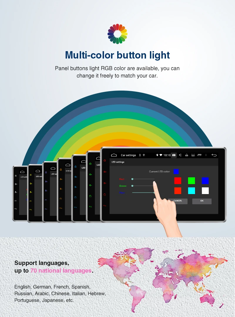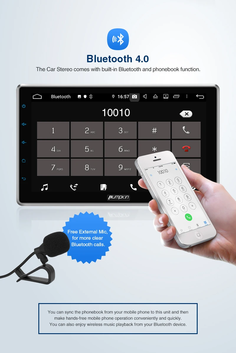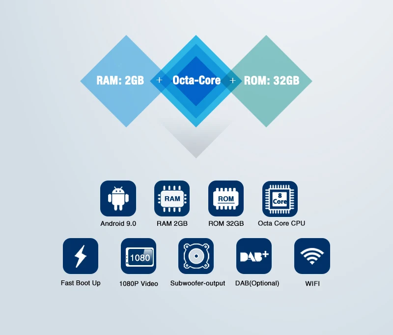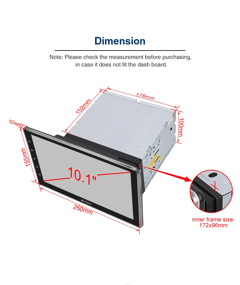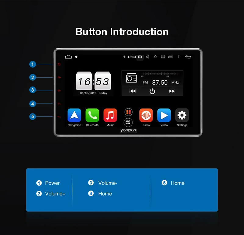 Pumpkin 2 Din 10.1''Android 9.0 Universal Car Radio No DVD Player GPS Navigation Octa-core 2G+32G Car Stereo Audio Wifi OBD2 DAB Specifications: General: OS: Android 9.0 CPU:Octa-core CPU Processor RAM: DDR3 2GB Nand Memory: 32GB Radio IC: NXPTEF6686 Bluetooth: BT 4.0 Working Voltage: 10.8~14.8V DC Audio output: 4*50W Max Boot time(2nd time): about 2s Screen: Screen Size: 10.1-Inch Digital Screen Resolution: 1024*600 Capacitive Touch Screen (5 points) Image Brightness /Contrast/ Color Adjustable EQ Built-in TDA7851L amplifier IC,Supports subwoofer audio output, and control it separately. Max audio output: 4 X 50W, Multi-color button light Panel buttons light RGB color are available, you can change it freely to match your car Phone Mirroring Mirror your phone on the 10.1inch screen . ForAndroidphone, youcanmirrorandcontrolontheunitviaUSBcableconnection, AirPlayForiPhone,youcanjustmirrorontheunitviawificonnection, cannotcontrol (support Android 7.0) GPS: Support online and off-line navi app, support 3D Maps and voice guidance,your long journey will no longer be bothered by the nightmare of getting lost. Map Storage Mode: Micro SD Card Voice Guidance: Yes 3D Map: Yes (Support radio/Bluetooth/USB/SDplayback while navigating.) DAB+ Digital Radio (Extra DAB+ box NA7001Brequired) Digital Audio Broadcasting allows you multi-regional music with your local well-known and also new channels. CD sound quality and noise-free in excellent transmission make DAB Radio a special experience in the vehicle. whichmakeDABbroadlyaccessibletomostofEurope. AV Output For this unit, it can output almost everything to your headrests, even you play the video from USB/SD /online youtube video, Many headunits in the market can only output the DVD video to the headrest. Bluetooth4.0 : Built-In Microphone in the control panel for hands free calling function External microphone also included for free clear voice calling Support Bluetooth audio player/Phone Book function, quick search contacts. (Attention: This function can only be realized when the mobile phone supports Bluetooth Audio Output/Contacts Output) Support Bluetooth Connection for iPhone/ Most Android Phones/ Even some None Smart Phone (Attention: The Bluetooth just for audio stream transfer, it doesn’t support file transfer or Internet tethering.) Steering Wheel Control Change the track, volume, etc. conveniently without taking your hands off the steering wheel, which makes your driving much safer. (Attention: Only support resistance based analog signal input steering wheel) Radio Highquality radio IC: NXP TEF6686 ,with good radio reception. AM/FM tuner built in (worldwide) AM frequency range: 522-1620 (Europe), 530-1710 (America), 522-1620 (Russia) FM frequency range: 87.5-108 (Europe), 87.5-107.9 (America), 65.0-108.0 (Russia) RDS Radio: Yes USB: Built in USB Port. Support USBdrive up to 64GB. Support Audio Formats: MP3/WMA/WAV/APE/FLAC/OGG/AC3, etc. Support Video Formats: RMVB/AVI/MPG/MPEG/VOB/MOV/ASF/FLV/3GP/MP4, etc. OSD Language: English, German, French, Russian, Spanish, Turkish, Portuguese, Arabic, Chinese, Italian, Thai, Hebrew, Danish,Hungarian,Dutch,Polish,Finnish,Greek,Bulgarian,Belgian,Swedish,Japanese,etc. OBD2 (Extra device required) Compatible:Most ofBluetoothtype ELM327 OBD2 scannerand wifi OBD2(Search Y0004/Y0034on our store) Compatible Application: Torque Display Data: Real-time data and trouble codes from vehicles computer. (Attention: Few cars may not support the ECU reading accessing, those cars will not work this function.) WIFI/3Ginternet 3G: Require external USB 3G modem (Search Y0014on our store) and your local Internet SIM card to be connected,Only support WCDMA3G bandwidth WIFI: Built in WIFI modem Direct turn on WIFI function to search and connect to any free WIFI hotspots (It comes with 1.5m long WIFI antenna for better signal reception.) Cam-In(Extra device required) Support RCA type reverse camera input, automatically trigger to reverse camera when reversingthe car. Please Note: -The item will be shipped within 1-2 business days from verified payment confirmed. -The item will be sent to your Aliexpress adress only,please make sure your adress is confirmed. -we will not be responsiable for any delay during delivery including but not limited to customs postage checking,strike etc. warranty will be voided as of