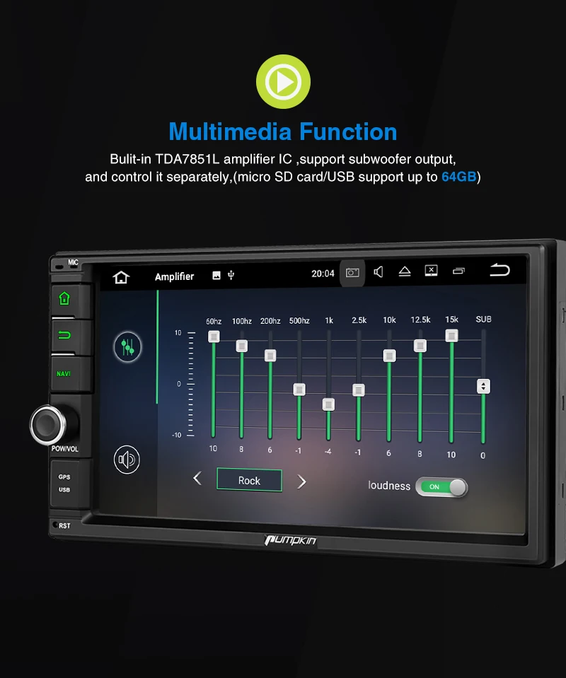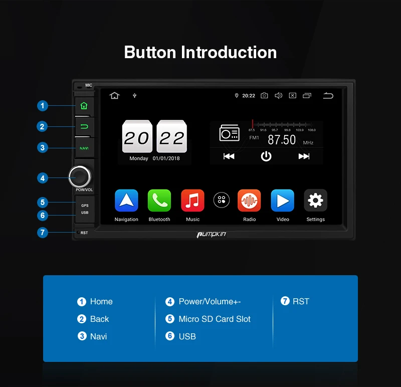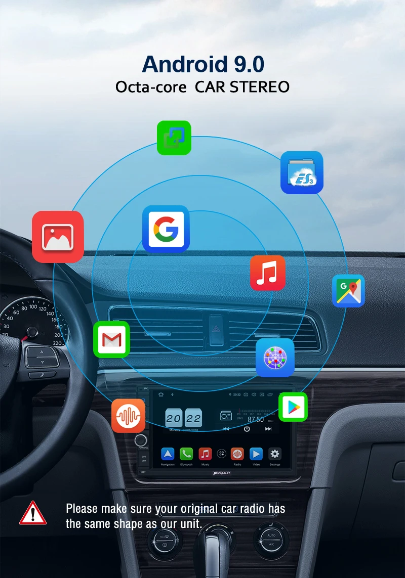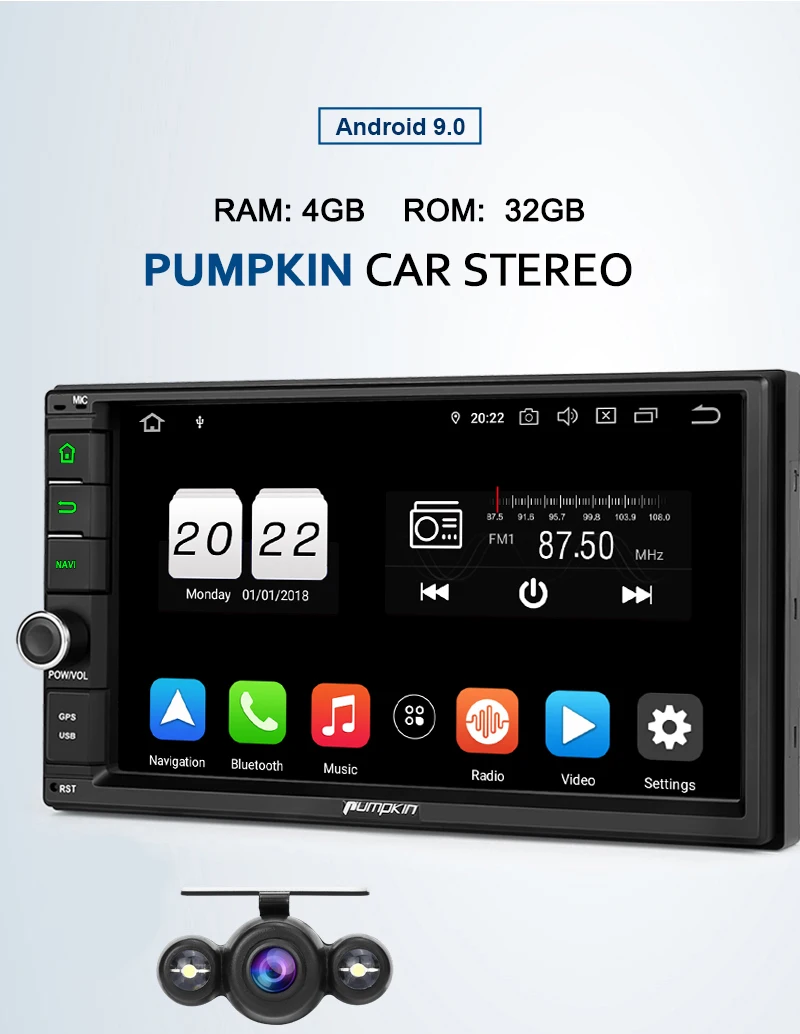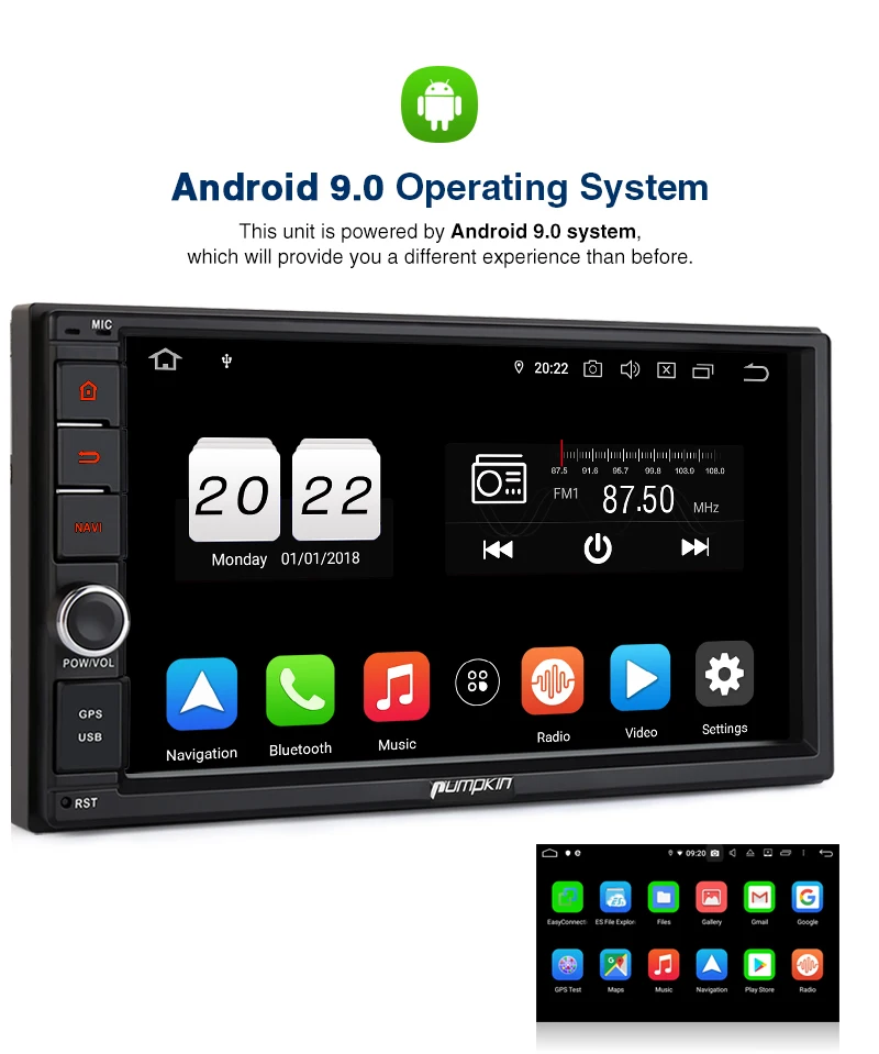 Pumpkin Octa Core RAM 4G ROM 32G 2 Din 7''Android 9.0 Universal Car Radio Audio Stereo NO DVD GPS Navigation Fast Boot Headunit Specifications: General: OS: Android 9.0 Pie CPU:Octa-core CPU Processor RAM: DDR3 4GB Nand Memory: 32GB Radio IC: NXP6686 Bluetooth: BT 4.0 Working Voltage: 10.8~14.8V DC Audio output: 4*50W Max Boot time(2nd time): about 1s Screen: Screen Size: 7-Inch display Screen Resolution: 1024*600 Capacitive Touch Screen (5 points) Image Brightness /Contrast/ Color Adjustable Operation System This unit is powered by Android 9.0system, Octa-core CPU Processor, which will provide you a different experience than before. EQ Built-in TDA7851amplifier IC, Supports subwoofer audio output, and control it separately. Max audio output: 4 X 50W, Multi-color button light Panel buttons light RGB color are available, you can change it freely to match your car. Phone Mirroring Mirror your phone on the 7inch screen. ForAndroidphone,youcanmirrorandcontrolontheunitviaUSBcableconnection, AirPlayForiPhone,youcanjustmirrorontheunitviawificonnection. GPS: Support online and off-line navi app, support 3D Maps and voice guidance,your long journey will no longer be bothered by the nightmare of getting lost. Map Storage Mode: Micro SD Card Voice Guidance: Yes 3D Map: Yes (Support radio/Bluetooth/USB/SDplayback while navigating.) DAB+ Digital Radio (Extra DAB+ box NA7001Brequired) Digital Audio Broadcasting allows you multi-regional music with your local well-known and also new channels. CD sound quality and noise-free in excellent transmission make DAB Radio a special experience in the vehicle. WhichmakeDABbroadlyaccessibletomostofEurope. AV Output For this unit, it can output almost everything to your headrests, even you play the video from USB/SD /online youtube video, Many headunits in the market can only output the DVD video to the headrest. Bluetooth4.0: Built-In Microphone in the control panel for hands free calling function External microphone also included for free clear voice calling Support Bluetooth audio player/Phone Book function, quick search contacts. (Attention: This function can only be realized when the mobile phone supports Bluetooth Audio Output/Contacts Output) Support Bluetooth Connection for iPhone/ Most Android Phones/ Even some None Smart Phone (Attention: The Bluetooth just for audio stream transfer, it doesn’t support file transfer or Internet tethering.) Steering Wheel Control Change the track, volume, etc. conveniently without taking your hands off the steering wheel, which makes your driving much safer. (Attention: Only support resistance based analog signal input steering wheel) Radio Highquality radio IC: NXP6686, with good radio reception AM/FM tuner built in (worldwide) AM frequency range: 522-1620 (Europe), 530-1710 (America), 522-1620 (Russia) FM frequency range: 87.5-108 (Europe), 87.5-107.9 (America), 65.0-108.0 (Russia) RDS Radio: Yes USB/SD: Built in micro SD card slot/ USB Port. Support SD card/ USBdrive up to 64GB. Support Audio Formats: MP3/WMA/WAV/APE/FLAC/OGG/AC3, etc. Support Video Formats: RMVB/AVI/MPG/MPEG/VOB/MOV/ASF/FLV/3GP/MP4, etc. OSD Language: English, German, French, Russian, Spanish, Turkish, Portuguese, Arabic, Chinese, Italian, Thai, Hebrew, Danish,Hungarian,Dutch,Polish,Finnish,Greek,Bulgarian,Belgian,Swedish,Japanese,etc. OBD2 (Extra device required) Compatible:Most ofBluetoothtype ELM327 OBD2 scannerand wifi OBD2(Search Y0004/Y0034on our store) Compatible Application: Torque Display Data: Real-time data and trouble codes from vehicles computer. (Attention: Few cars may not support the ECU reading accessing, those cars will not work this function.) WIFI/4Ginternet 4Ginternet (Extra device required) Support 4Ginternet,Require external USB 4G modem. WIFI: Built in WIFI modem Direct turn on WIFI function to search and connect to any free WIFI hotspots (It comes with 1.5m long WIFI antenna for better signal reception.) Cam-In(Extra device required) Support RCA type reverse camera input, automatically trigger to reverse camera when reversingthe car. Please Note: -The item will be shipped within 1-2 business days from verified payment confirmed. -The item will be sent to your Aliexpress adress only,please make sure your adress is confirmed. -we will not be responsiable for any delay during delivery including but not limited to customs postage checking,strike etc. warranty will be voided as of