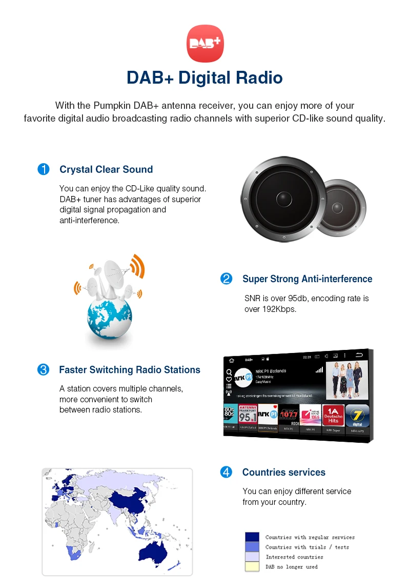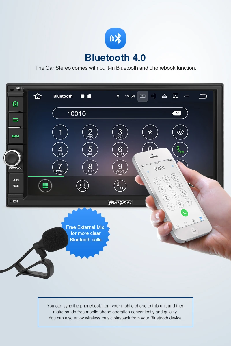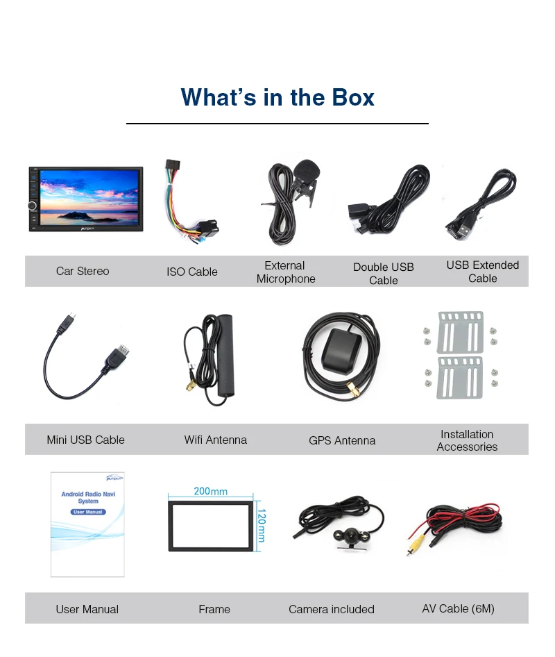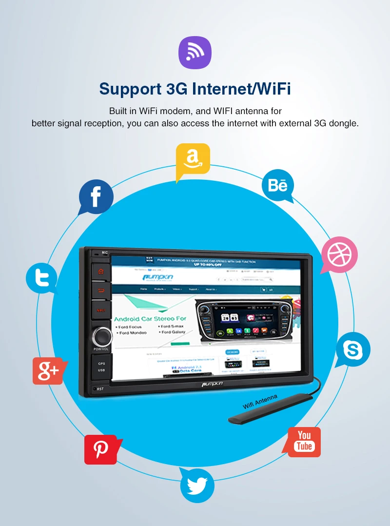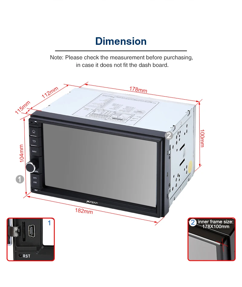 Pumpkin Octa Core RAM 4G ROM 32G 2 Din 7''Android 9.0 Universal Car Radio Audio Stereo NO DVD GPS Navigation Fast Boot Headunit Specifications: General: OS: Android 9.0 Pie CPU:Octa-core CPU Processor RAM: DDR3 4GB Nand Memory: 32GB Radio IC: NXP6686 Bluetooth: BT 4.0 Working Voltage: 10.8~14.8V DC Audio output: 4*50W Max Boot time(2nd time): about 1s Screen: Screen Size: 7-Inch display Screen Resolution: 1024*600 Capacitive Touch Screen (5 points) Image Brightness /Contrast/ Color Adjustable Operation System This unit is powered by Android 9.0system, Octa-core CPU Processor, which will provide you a different experience than before. EQ Built-in TDA7851amplifier IC, Supports subwoofer audio output, and control it separately. Max audio output: 4 X 50W, Multi-color button light Panel buttons light RGB color are available, you can change it freely to match your car. Phone Mirroring Mirror your phone on the 7inch screen. ForAndroidphone,youcanmirrorandcontrolontheunitviaUSBcableconnection, AirPlayForiPhone,youcanjustmirrorontheunitviawificonnection. GPS: Support online and off-line navi app, support 3D Maps and voice guidance,your long journey will no longer be bothered by the nightmare of getting lost. Map Storage Mode: Micro SD Card Voice Guidance: Yes 3D Map: Yes (Support radio/Bluetooth/USB/SDplayback while navigating.) DAB+ Digital Radio (Extra DAB+ box NA7001Brequired) Digital Audio Broadcasting allows you multi-regional music with your local well-known and also new channels. CD sound quality and noise-free in excellent transmission make DAB Radio a special experience in the vehicle. WhichmakeDABbroadlyaccessibletomostofEurope. AV Output For this unit, it can output almost everything to your headrests, even you play the video from USB/SD /online youtube video, Many headunits in the market can only output the DVD video to the headrest. Bluetooth4.0: Built-In Microphone in the control panel for hands free calling function External microphone also included for free clear voice calling Support Bluetooth audio player/Phone Book function, quick search contacts. (Attention: This function can only be realized when the mobile phone supports Bluetooth Audio Output/Contacts Output) Support Bluetooth Connection for iPhone/ Most Android Phones/ Even some None Smart Phone (Attention: The Bluetooth just for audio stream transfer, it doesn’t support file transfer or Internet tethering.) Steering Wheel Control Change the track, volume, etc. conveniently without taking your hands off the steering wheel, which makes your driving much safer. (Attention: Only support resistance based analog signal input steering wheel) Radio Highquality radio IC: NXP6686, with good radio reception AM/FM tuner built in (worldwide) AM frequency range: 522-1620 (Europe), 530-1710 (America), 522-1620 (Russia) FM frequency range: 87.5-108 (Europe), 87.5-107.9 (America), 65.0-108.0 (Russia) RDS Radio: Yes USB/SD: Built in micro SD card slot/ USB Port. Support SD card/ USBdrive up to 64GB. Support Audio Formats: MP3/WMA/WAV/APE/FLAC/OGG/AC3, etc. Support Video Formats: RMVB/AVI/MPG/MPEG/VOB/MOV/ASF/FLV/3GP/MP4, etc. OSD Language: English, German, French, Russian, Spanish, Turkish, Portuguese, Arabic, Chinese, Italian, Thai, Hebrew, Danish,Hungarian,Dutch,Polish,Finnish,Greek,Bulgarian,Belgian,Swedish,Japanese,etc. OBD2 (Extra device required) Compatible:Most ofBluetoothtype ELM327 OBD2 scannerand wifi OBD2(Search Y0004/Y0034on our store) Compatible Application: Torque Display Data: Real-time data and trouble codes from vehicles computer. (Attention: Few cars may not support the ECU reading accessing, those cars will not work this function.) WIFI/4Ginternet 4Ginternet (Extra device required) Support 4Ginternet,Require external USB 4G modem. WIFI: Built in WIFI modem Direct turn on WIFI function to search and connect to any free WIFI hotspots (It comes with 1.5m long WIFI antenna for better signal reception.) Cam-In(Extra device required) Support RCA type reverse camera input, automatically trigger to reverse camera when reversingthe car. Please Note: -The item will be shipped within 1-2 business days from verified payment confirmed. -The item will be sent to your Aliexpress adress only,please make sure your adress is confirmed. -we will not be responsiable for any delay during delivery including but not limited to customs postage checking,strike etc. warranty will be voided as of