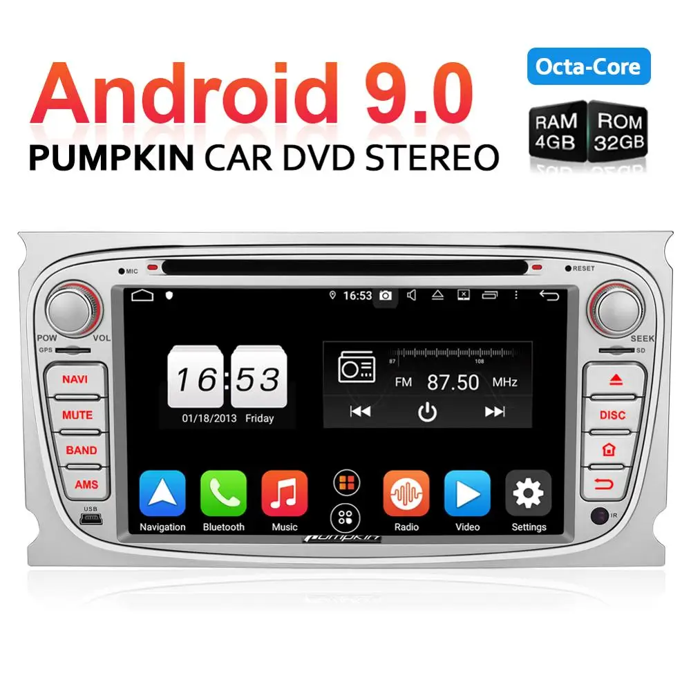 Pumpkin 2 Din Android 9.0 Car DVD Player GPS Navigation Qcta-Core Car Stereo For Ford Focus/Mondeo 4G Wifi FM Rds Radio HeadunitApplicable Models:The following car model and year are for reference, please make sure your original car radio has the same shape as our unit.Ford Mondeo(2007-2011)Ford S-max(2008-2012)Ford Focus(2008-2010)Ford Galaxy(2010-2012)(Notice:This unit can not support the original car's convers+ function.)Specifications:OS: Android 9.0 PieCPU: 8-Core 64-bit CPU Coretex-A53RAM: 4GBROM: 32GBRadio IC: NXP6686Bluetooth: BT 4.0Working Voltage: 10.8~14.8V DCAudio output: 4*50W MaxBoot time(2nd time): about 1sScreen:Screen Size: 7-Inch Digital ScreenResolution: 1024*600Capacitive Touch Screen (5 points)Image Brightness /Contrast/ Color AdjustableOperation SystemThis unit is powered by Android9.0 system, 8-Core 64-bit CPU which will provide you a different experience than before.EQBuilt-in TDA7851L amplifier IC,Supports subwoofer audio output, and control it separately.Max audio output: 4 X 50W,Multi-color button lightPanel buttons light RGB color are available, you can change it freely to match your vehicle.Phone MirroringMirror your phone on the 7 inch screen.For Android phone ,you can mirror and control on the unit via USB cable connection ,Air Play For iPhone, you can just mirror on the unit via wifi connection ,can not controlGPS:Support online and off-line navi app, support 3D Maps and voice guidance, your long journey will no longer be bothered by the nightmare of getting lost.Map Storage Mode: Micro SD CardVoice Guidance: Yes3D Map: Yes(Support radio/Bluetooth/USB/SD playback while navigating.)DAB+ Digital Radio (Extra DAB+ box NA7001B required)Digital Audio Broadcasting allows you multi-regional music with your local well-known and also new channels. CD sound quality and noise-free in excellent transmission make DAB Radio a special experience in the vehicle.which make DAB broadly accessible to most of Europe.AV OutputFor this unit, it can output the DVD or AUX video to the headrest.Bluetooth 4.0:Built-In Microphone in the control panel for hands free calling functionExternal microphone also included for free clear voice callingSupport Bluetooth audio player/Phone Book function, quick search contacts.(Attention: This function can only be realized when the mobile phone supports Bluetooth Audio Output/Contacts Output)Support Bluetooth Connection for iPhone/ Most Android Phones/ Even some None Smart Phone(Attention: The Bluetooth just for audio stream transfer, it doesn’t support file transfer or Internet tethering.)Steering Wheel ControlChange the track, volume, etc. conveniently without taking your hands off the steering wheel, which makes your driving much safer.RadioHigh quality radio IC: NXP6686, with good radio reception.AM/FM tuner built in (worldwide)AM frequency range: 522-1620 (Europe), 530-1710 (America), 522-1620 (Russia)FM frequency range: 87.5-108 (Europe), 87.5-107.9 (America), 65.0-109.0 (Russia)RDS Radio: YesUSB/SD:Built in micro SD card slot/ USB Port.Support SD card/ USB drive up to 128GB.Support Audio Formats: MP3/WMA/WAV/APE/FLAC/OGG/AC3, etc.Support Video Formats: RMVB/AVI/MPG/MPEG/VOB/MOV/ASF/FLV/3GP/MP4, etc.OSD Language:English, German, French, Russian, Spanish, Turkish, Portuguese, Arabic, Chinese, Italian, Thai, Hebrew, Danish,Hungarian,Dutch,Polish,Finnish,Greek,Bulgarian,Belgian,Swedish,Japanese,etc.OBD2 (Extra device required)Compatible: Most of Bluetooth type ELM327 OBD2 scanner and wifi OBD2 (Search Y0004/Y0034 on our store)Compatible Application: TorqueDisplay Data: Real-time data and trouble codes from vehicles computer.(Attention: Few cars may not support the ECU reading accessing, those cars will not work this function.)WIFI/4G internet4G internet (Extra device required)Support 4G internet, Require external USB 4G modem. WIFI: Built in WIFI modemDirect turn on WIFI function to search and connect to any free WIFI hotspots(It comes with 1.5m long WIFI antenna for better signal reception.)Cam-In(Extra device required)Support RCA type reverse camera input, automatically trigger to reverse camera when reversing the car. DVDSupport all formatsDVD drive: Region FreeCompatible Formats: AVI/DVD/DVD+R/DVD-R/DVD+RW/DVD-RW/VCD/MP3/CD/CD-RW/JPEG etc.