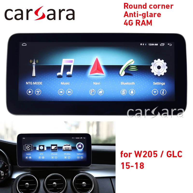 Mercedes navigation W205 GLC DVD android screen round corner video display anti-glare GPS radio 4g ram stereo multimedia display Compatible withLeft hand drive and right hand drive C class W205, GLC class2015 to 2018 with NTG5 Features Round corner HD resolution 1280*480 Anti-glare Latest UI style like origianl comand system NTG5.5 Octacore 4G RAM 64 ROM Plug and play, jack by jack connection without damage to car Preserve original system and functions Support car console joystick control Support car steering wheel buttons Support original reverse camera and aftermarket reverse camera video with reversing trajectory Support navigation software like Google map, Sygic, iGo, Waze, etc. Play 1080P video Play lossless audio Support screen mirror link with iPhone, Android phone by third party app easyconnection Support 4G network TD-LTE: B39 / B40 / B41; FDD-LTE: B1 / B3 / B7 / B8 in Asia-Pacific region (not support 3G/4G outside Asia-Pacific region) Built-in Bluetooth, support BT hand free call, BT music Built-in Wi-Fi, support to share network to display by phone hotspot Specification CPU Octa core RAM Memory DDR3 4GB NAND FLASH eMMC 64GB Touch Screen 10.25 inch 5 Point Capacitive Touch Screen Resolution 1280*480 Start-up Time About 20S Operating System Android 8 Video Format AVI, MKV, MP4, MPEG, WMV, MOV, FLV,3GP Audio Format MP3, WKV, WAV, AAC, FLAC Image Format JPEG, BMP, PNG, GIF GPS Built-in MAP Support Google map, Sygic, iGO, Waze, etc. WIFI Built-in WIFI module 4G Network TD-LTE: B39 / B40 / B41; FDD-LTE: B1 / B3 / B7 / B8 (Support 4G in only Asia-Pacific region) Bluetooth Built-in Bluetooth module Slots 2 USB 2.0 port, 1 TF card slot, 1 sim card slot Working Tempertarure -40degC-----+70degC Standby Current <8MA Working Voltage 10~16V OSD Language Danish, Dutch, English, Filipino, French, German, Greek, Hindi, Italian, Japanese, Korean, Polish, Portuguese, Russian, Serbian, Spanish, Swedish, Thai, Turkish, Vietnamese, etc. UI Style Package Content Package includes the Android screen, GPS antenna, Power cable, USB cable, LVDS cable. After Installation